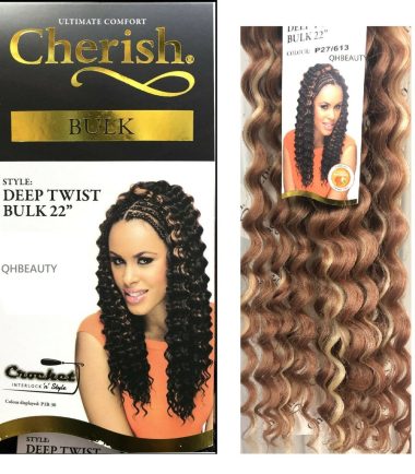 Cherish Deep Twist Bulk 22” Crochet Hair Braids in all colours! Made from high-quality Cherish Hair, these Crochet Hair Braids are designed to be easy to knit and shine like human hair.The Cherish Water Wave fiber used in these braids is the most delicate and unique, providing a truly natural